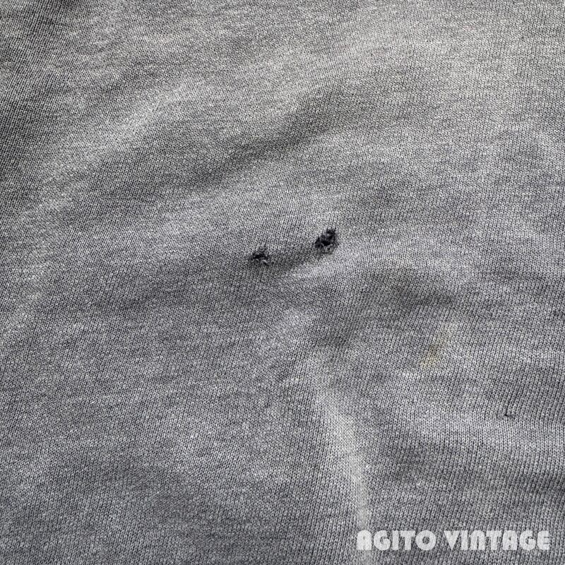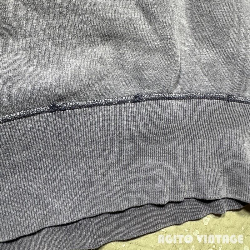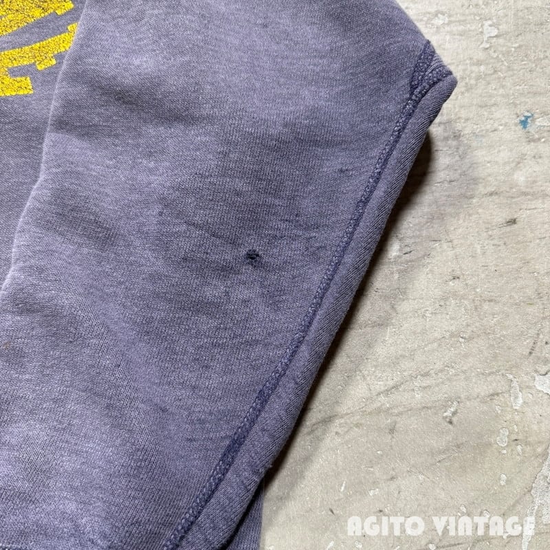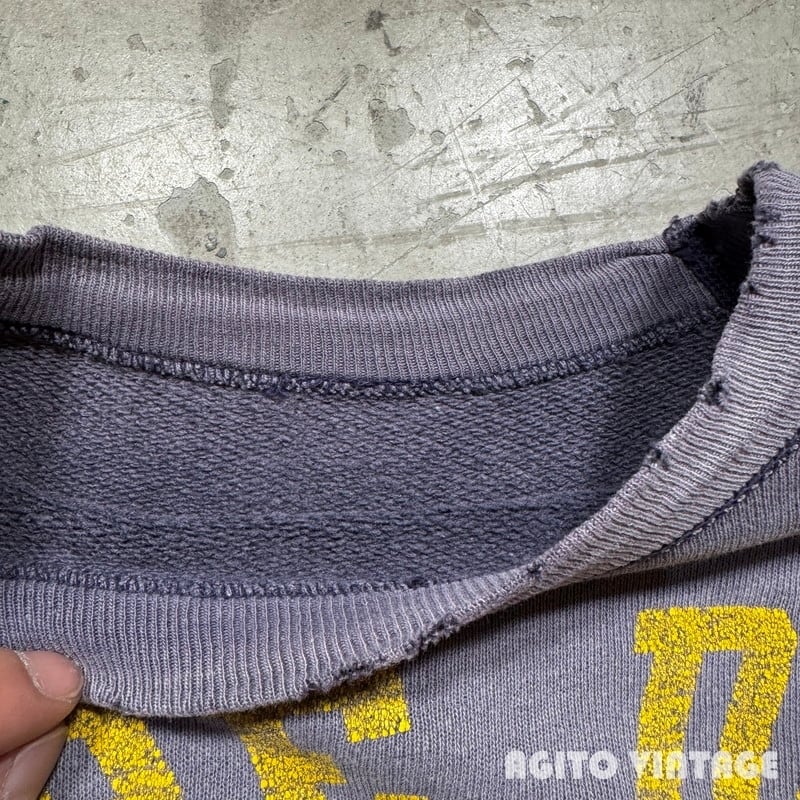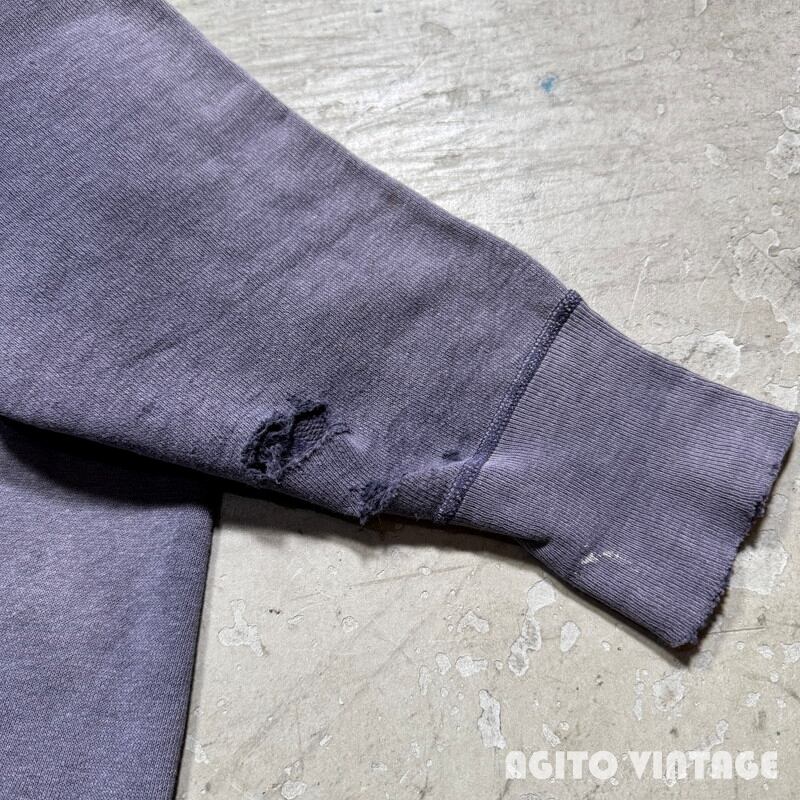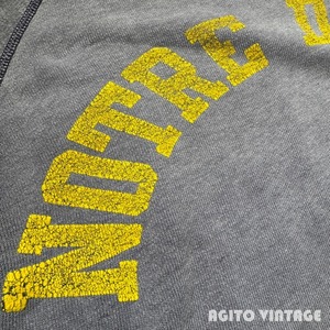 50年代から60年代頃のUnknownラグランカレッジスウェットです。タグが欠損していますのでブランドは不明です。ネックは2本針、その他は4本針で縫製されています。フロントにはNOTRE DAMEのプリントが入ります。脇下にガゼットがある仕様です。元々ネイビーだと思われますが、グレーに近いような褪色をしています。ネックや、両袖、リブやボディ等にダメージがいくつもございます。こちらのスウェットも比較的サイズ感に湯つ鳥があるように思いますのでL相当かと思われます。フェードしたボディに擦れたイエローのプリントが非常にカッコ良いので雰囲気系のスウェットがお好きな方は是非この機会にいかがでしょうか。