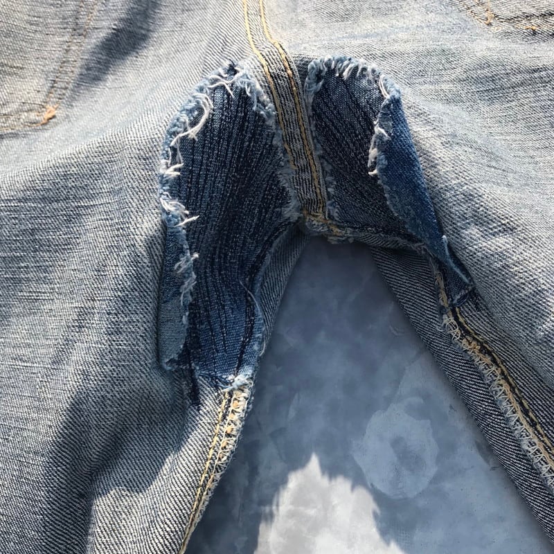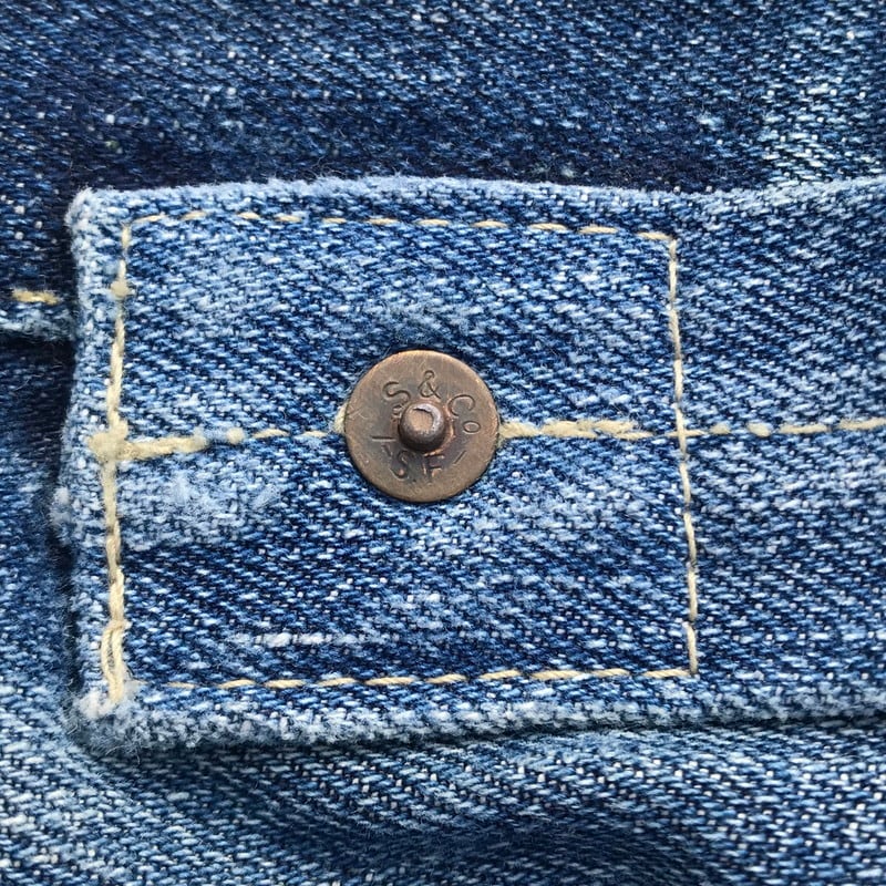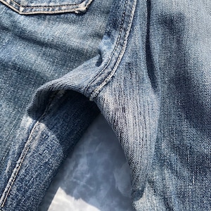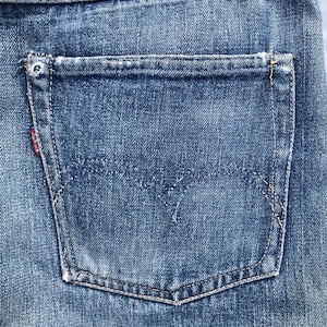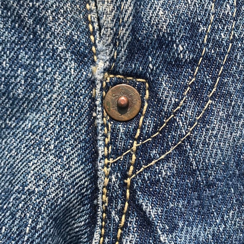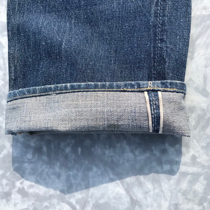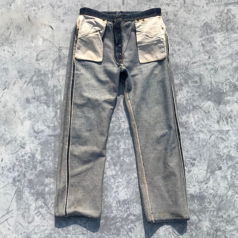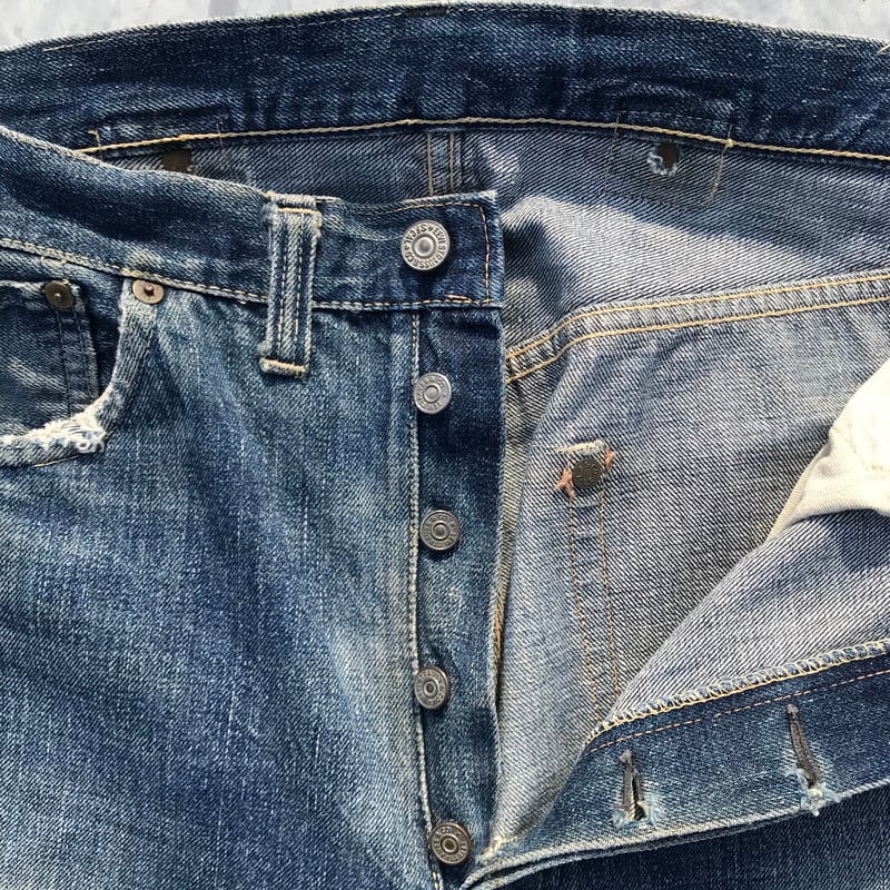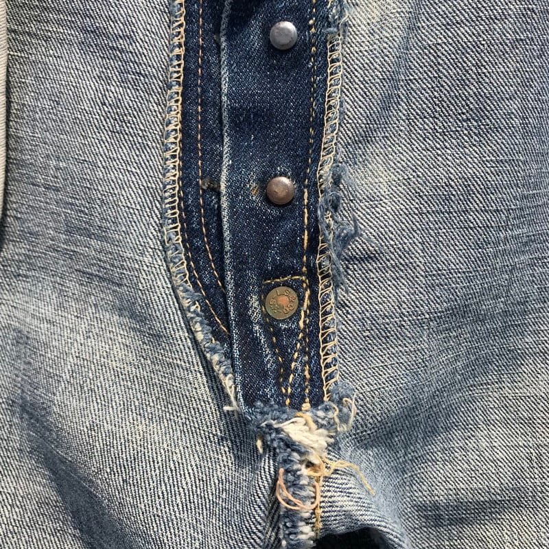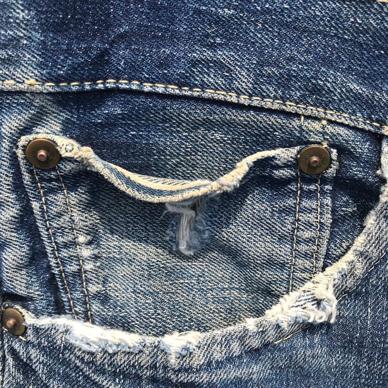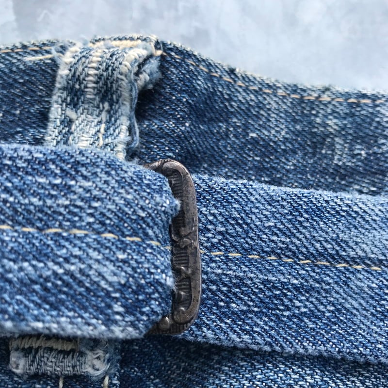 37年~41年頃のリーバイス501XXのオリジナルです。1937年にサスペンダーボタンが廃止され、リーバイスのアイコンである赤タブ付き隠しリベットが採用され始めた通称37モデルと呼ばれるデニムです。大戦モデルのひとつ前のモデルという位置付けから個体数も少なく希少な1本です。シンチバックがリペアで付け替えられており、右側のサイドステッチがリペアで短くなっています。またからお尻にかけてもリペアがあり、右バックポケットは手縫されています。全体にフェードしダメージやリペア箇所もございますが、年代を考慮しても奇跡の1本といえます。