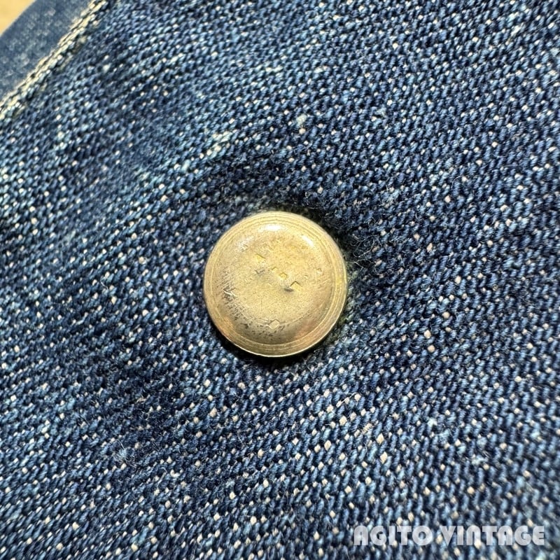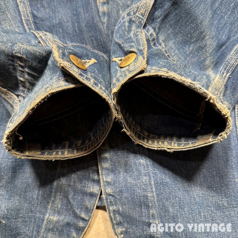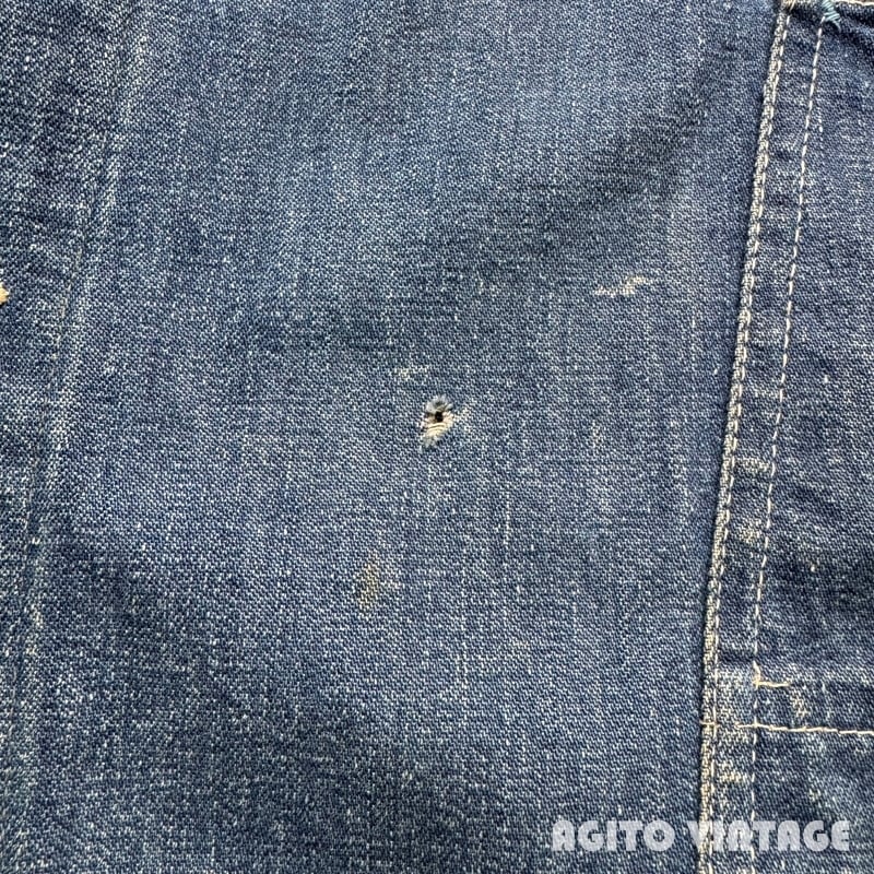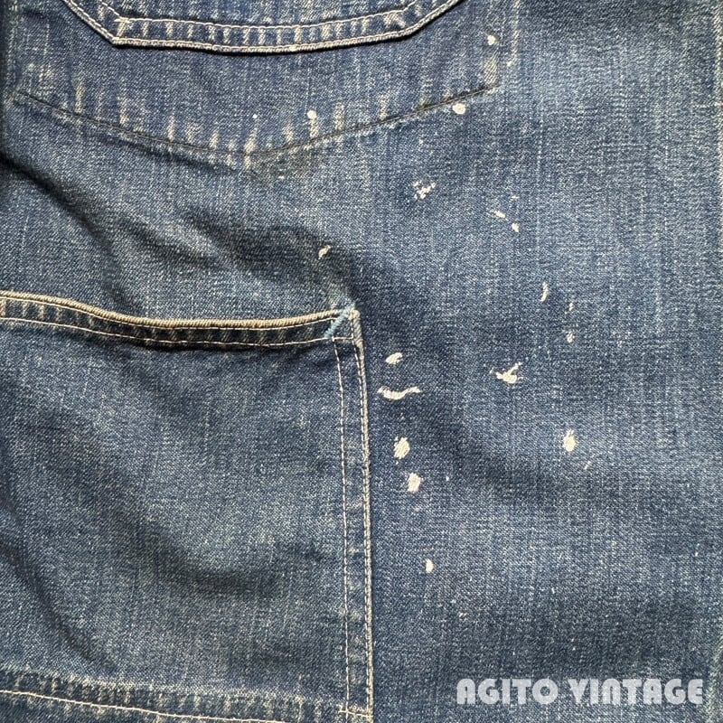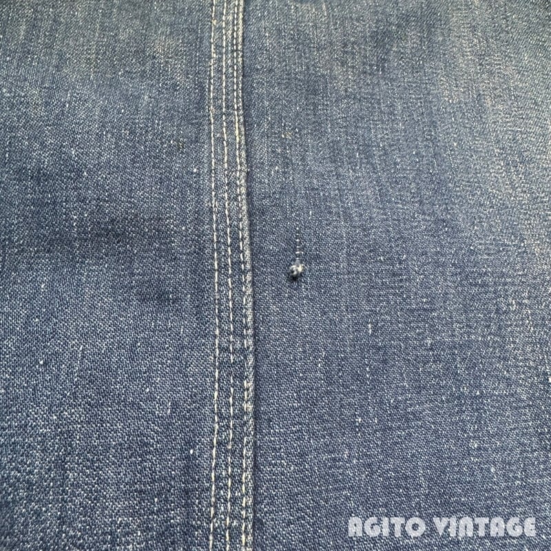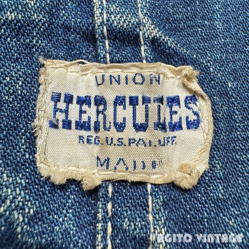 40年代後期から50年代初頭頃のHERCULESデニムカバーオールです。HERCULESはアメリカ3大ストアで知られるSearsがワークウェアを展開していたプライベートブランドです。ご紹介するこちらは比較的色味が残った個体で、®マークの入らない刺繍のタグが付きます。ボタン裏は大戦期等古い物に見られる2プロングと呼ばれる2つの爪の跡が確認できます。フロントに一部ペンキが飛んでいます。袖口に若干ダメージがございます。その他薄汚れ等ございますが、年代を考慮してもコンディションは良好だと思います。サイズ表記はございませんが、L~XL相当かと思います。着丈がやや長めな作りをしています。一時期に比べ見かける機会がグッと減ったヴィンテージカバーオールで、コンディションの良い物となるとなかなか出会わないのかなと思います。お探しでサイズが合う方は是非この機会にいかがでしょうか。