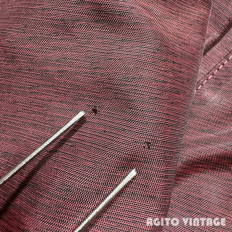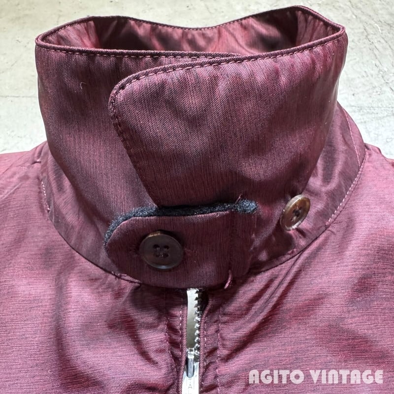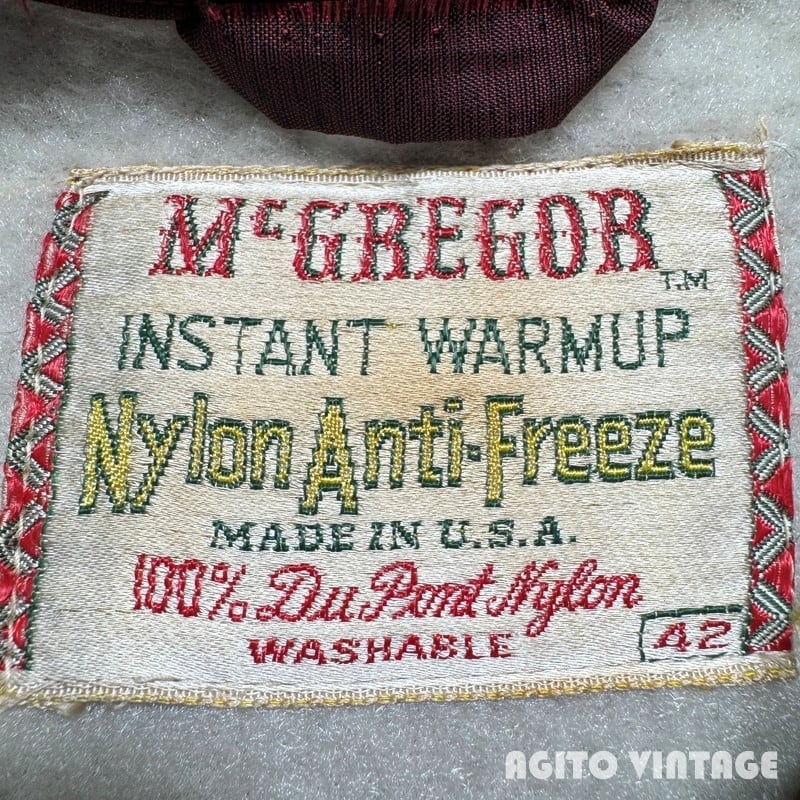 50年代頃のMcGREGOR Nylon Anti-Freezeです。1955年に製作された映画「理由なき反抗」で主演のジェームスディーンが着用していた事で知られるモデルです。一般的に知られるアンチフリーズは単色(赤やスレートブルーなど)のイメージが強いですが、ご紹介するこちらの個体は、エンジ×ブラックのミックスカラーでスウェットでいう杢のような色味が特徴的です。どこか絣柄のような印象も受けます。フロントはアルミのTALONジッパーが使用されています。襟には小さなチンストラップが付きますが、ボタンが欠損していましたので似たサイズの物を取り付けております。袖先や裾等に細かな擦れがあり、右袖には小さなピンホールが2箇所、僅かな擦れが見られます。両袖共にうっすらとですが、白っぽいシミがございます。裾の一部に小さな簡易的なハンドリペアがございます。その他は比較的コンディションの良い1着です。42表記でL相当のサイズ感です。当時のジェームスディーンのようにジャストサイズで合わせても非常にカッコ良いので、50年代頃のスタイルがお好きな方は是非この機会にいかがでしょうか。色味も珍しくオススメです。