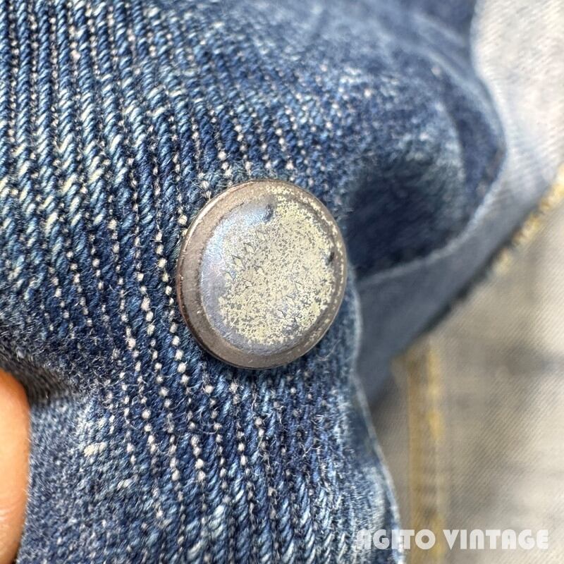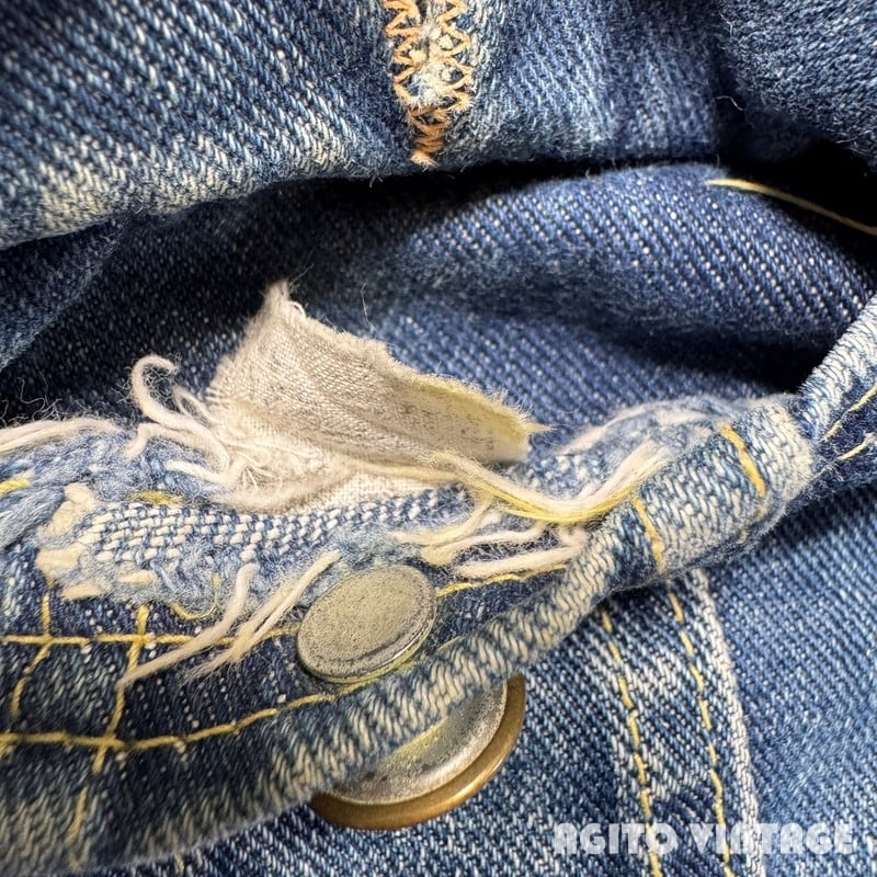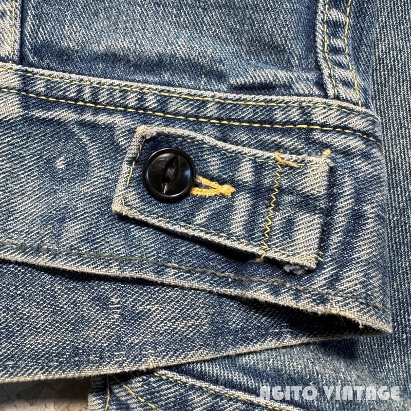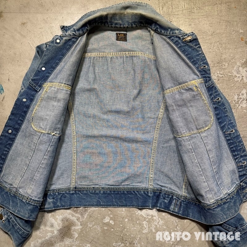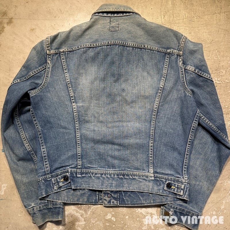 70年代初頭頃のLee 101-Jデニムジャケットです。首タグ、胸元のピスネーム共にMR表記が入る個体です。ボタン裏はドット刻印です。全体的に褪色しており、特に袖が色落ちしています。襟や袖先、裾などに擦れがございます。右袖先に小さなダメージがございます。左アームホールと左袖にステッチ飛びがあったのでリペア屋さんでリステッチしていただきました。左袖に細かな錆の様な汚れもございます。その他細かな薄汚れ等ございますが、ヴィンテージデニムジャケットとしては雰囲気も良いかと思います。42LONG表記ですので一般的な101-Jに比べ着丈が長いモデルです。これからの春先に誓い易い色味ですのでお探しだった方は是非この機会にいかがでしょうか。