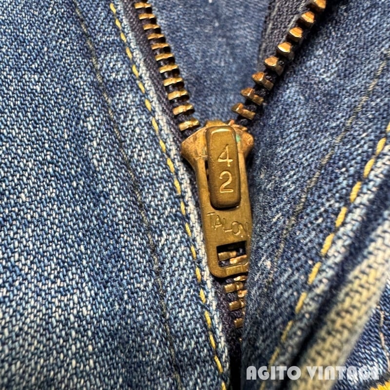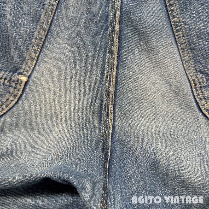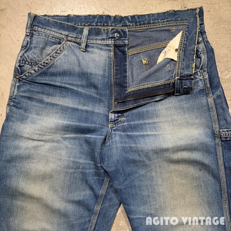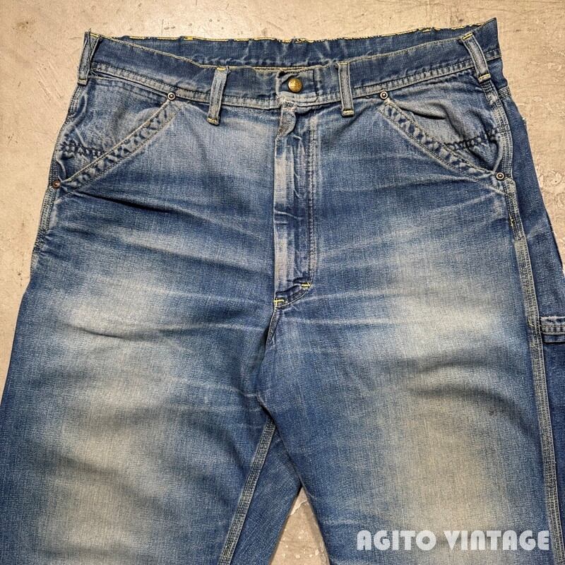 60年代後半から70年代初頭頃のLee191Zデニムペインターパンツです。JELT DENIMを使用しているこちらはバックポケットに赤タグが付き、®、MR、UNION MADE IN USA表記有り。フロントは42TALONジッパーが使用されています。全体的に色落ちがあり、フロントには見事なヒゲ、膝裏にはハチノスが入る個体です。ジッパー付近に2箇所リペアが有り、ベルトループに1箇所リペア有、臀部には補強として接着芯の上からタタキが入ります。ウエストなどにステッチ飛びが見られます。両裾共には擦れによるダメージがございます。その他細かな薄汚れ等ございます。ウエストは実寸でW36インチ相当です。ペインターパンツとしてはお探しの方も多いゆったりサイズです。使用感はございますが、ヒゲなどワークウェアらしい雰囲気でヴィンテージスタイルに嵌る1本です。サイズも含めお探しだった方は是非この機会をお見逃しなく。