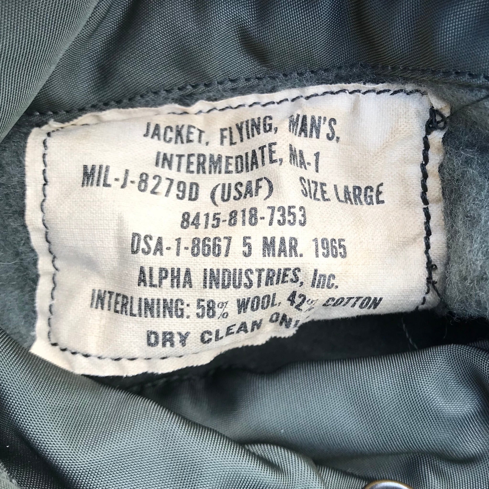65年コントラクトのALPHA MA-1フライトジャケットです。MIL-J-8279D