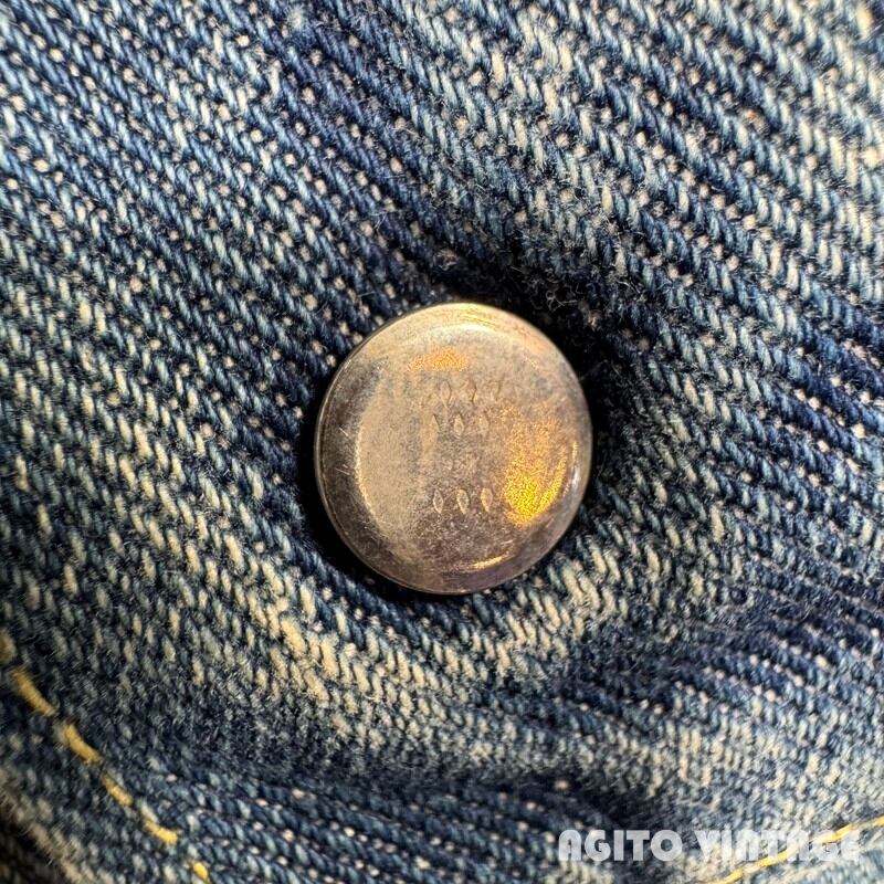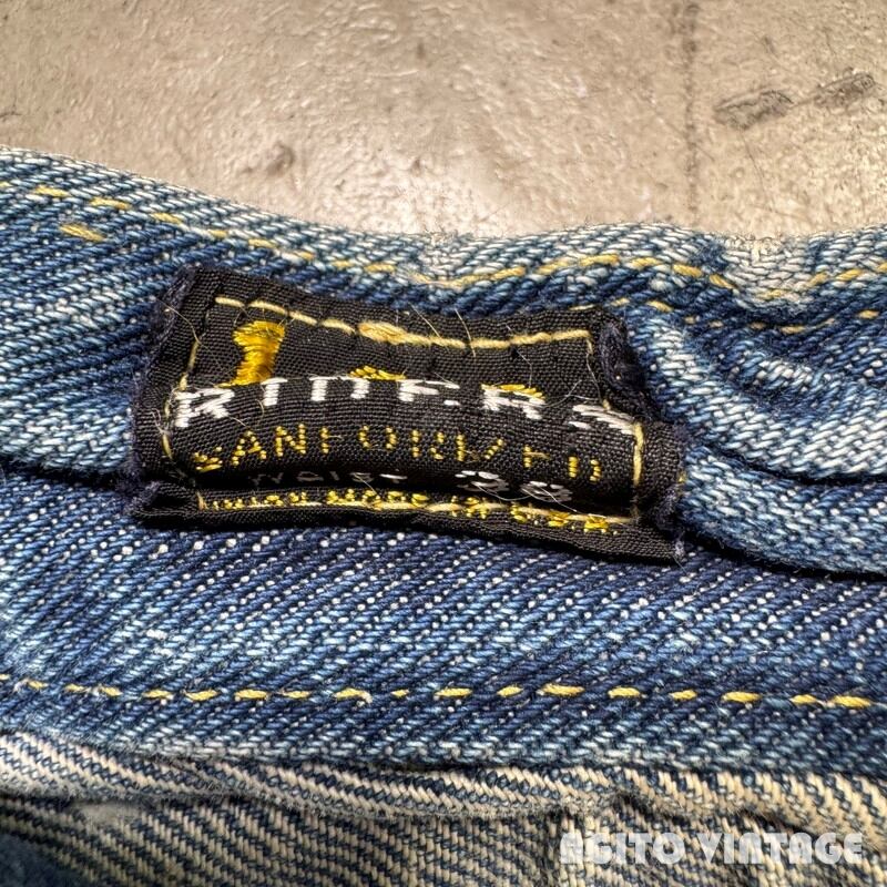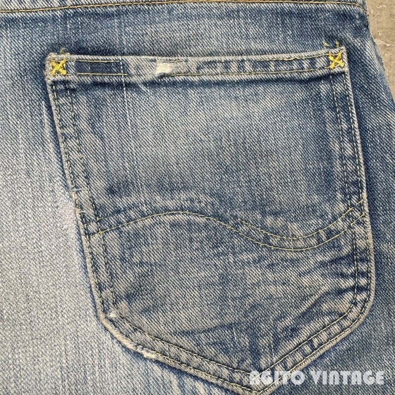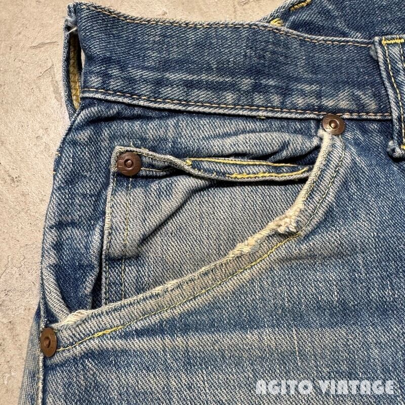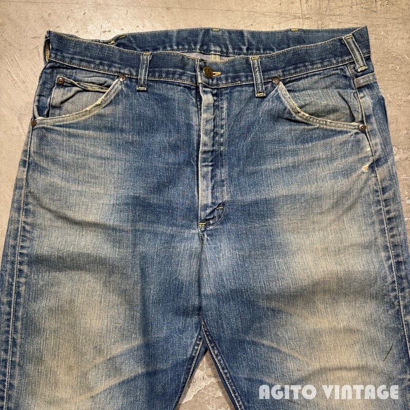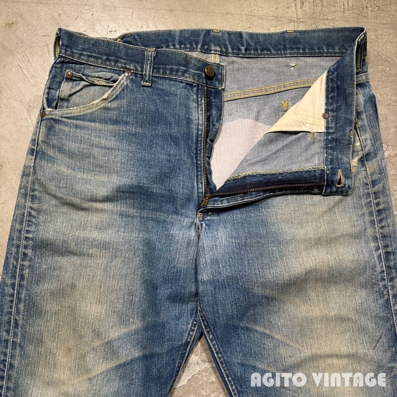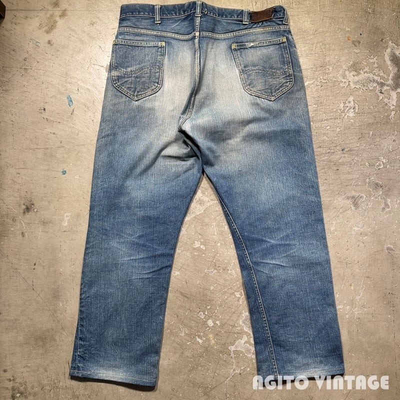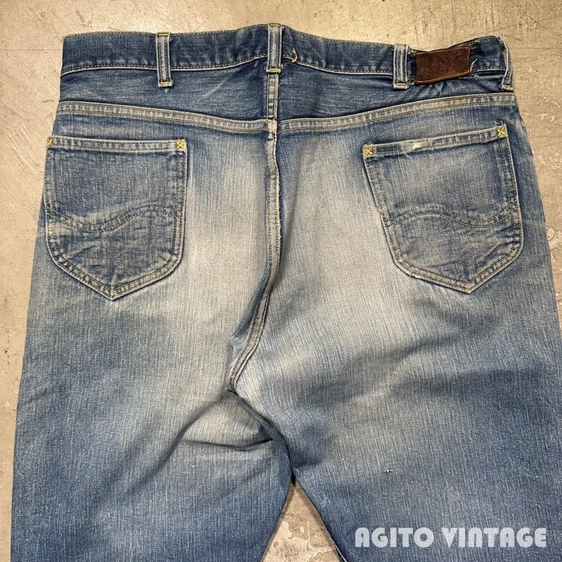 60年代から70年代頃のLee 101Zデニムパンツです。トップボタン裏ドット刻印、GRIPPERカムロックジッパー、当て布有り、ピスネーム欠損、アウトシームは脇割りです。色残りは3~4割程ですが、濃淡のある色落ちがヴィンテージデニムらしい1本です。両ポケット縁に擦れによるダメージがあり、左ハンドポケット下部にも小さなダメージがございます。臀部にはダメージはありませんでしたが補強の為にタタキリペアを施していただきました。裾はシングルステッチで裾上げが施されています。レザーパッチはビーフジャーキー状に縮んでいます。その他擦れやステッチ飛び等使用感はございますが、全体的に雰囲気の良い個体だと思います。ウエスト表記はW38ですがやや縮みがあり実寸W37インチです。サイズはやや大き目ですが色落ちのバランスも良くルーズめに穿きたい方にはお勧めな1本です。フェード感の強いヴィンテージスウェットなどと合わせてみてはいかがでしょうか。
