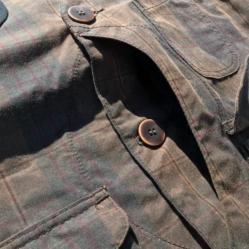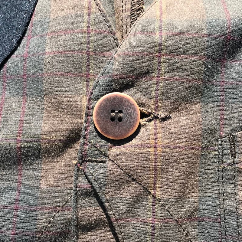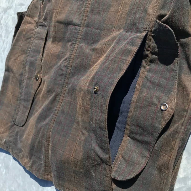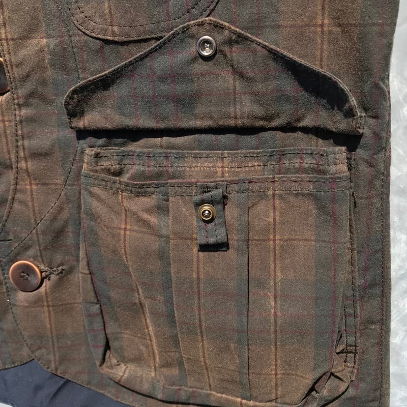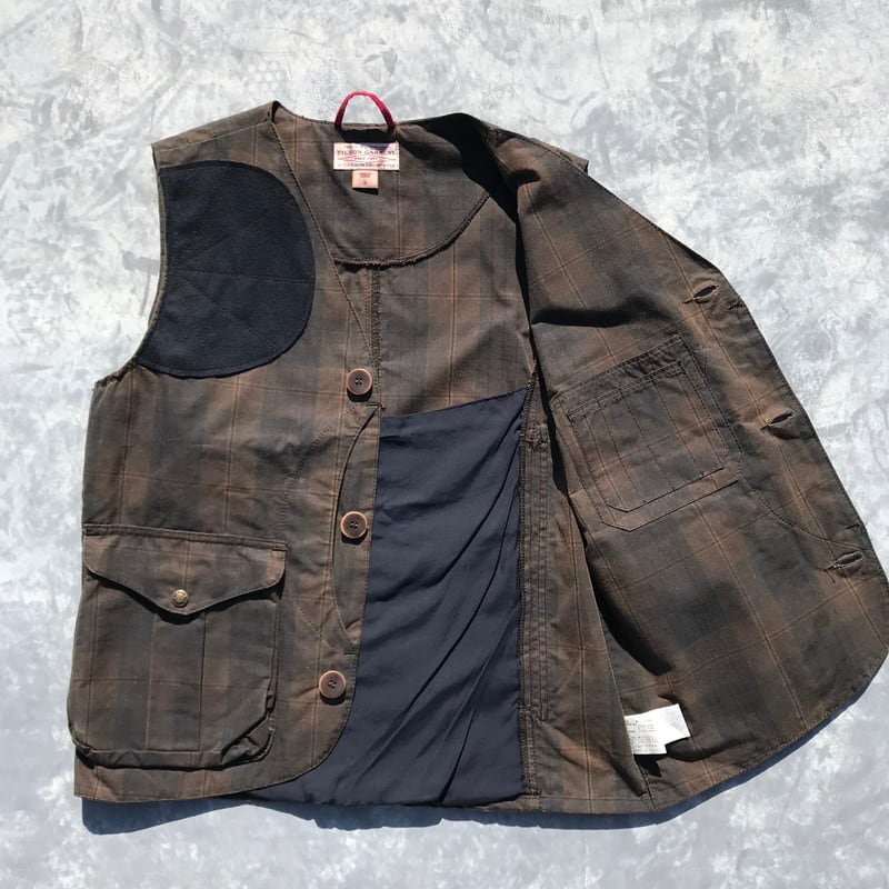 FILSONのガイドベストです。オイルドクロスしようなので、雨にも強く、あまり見かけないチェック柄となっております。前面の大きなポケットはサイドのボタンを外すとマチも広くなり、よりたくさんの物を入れる事ができます。背面にはゲームポケットもあり収納力もたっぷりです。生地の特性上スレなどはございますが、大きなダメージなども無く状態は良好です。オイルドクロス特有の匂いもきつくありません。インナーにもトップスにもつかえますので、コーディネートの幅が広がるアイテムです。