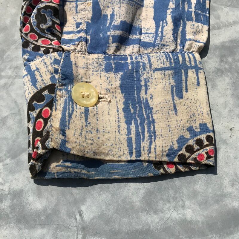 40年代頃のMYRON OF CALIFORNIAの長袖レーヨンアロハシャツです。丸い紋章のような柄にハンドペイント風の柄の組み合わせが珍しい1着です。古いシェルボタンが使われています。ボタントップのループ欠損もございません。首元や袖口に薄汚れがございますが、大きなダメージも無く年代物としては状態も悪くない美品といえます。Mサイズというゴールデンサイズですので、お探しだった方は必見です。